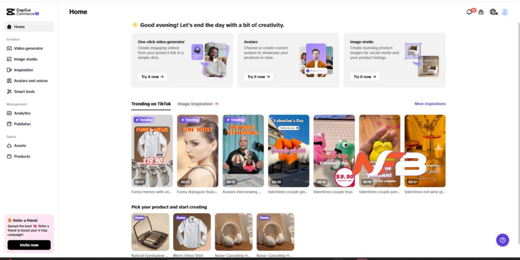 Sign up for CapCut Commerce Pro, navigate to your dashboard, and select “Video Generator” > “Video Editor.” Upload your video by clicking “Click to upload” or dragging it into the editor.