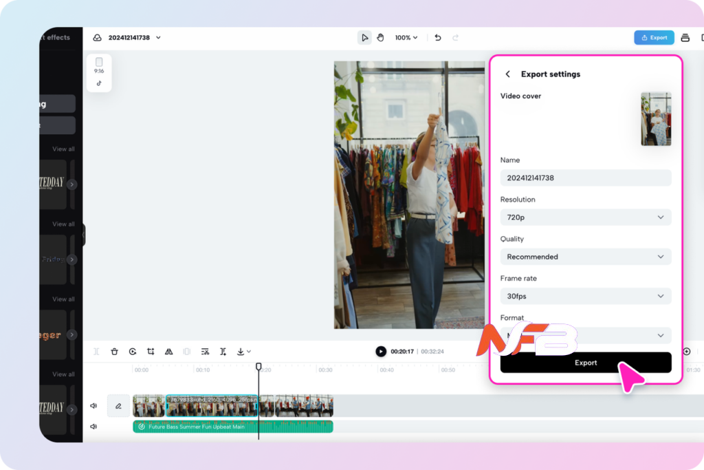 Click “Export” in the top right, choose your preferred settings, and save the file. To share instantly, select “Publish” and post directly to social media.
